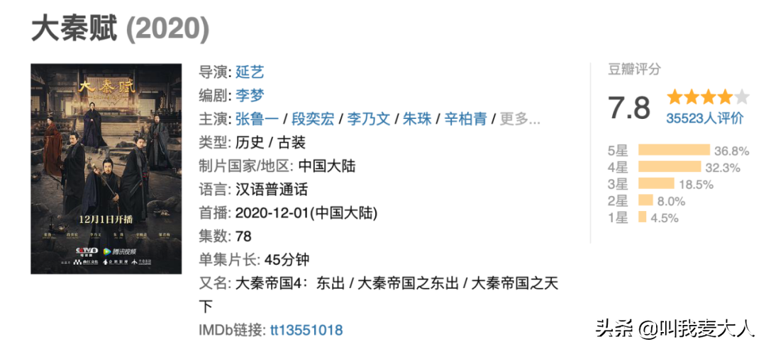 开头的豆瓣评分8.9,与大秦帝国第一、第二部的评分9.3,相差无几。