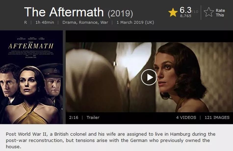 《余波》根据rhidian brook同名小说改编,讲述二战失败后的德国汉堡一片废墟。英军上校刘易斯奉命驻扎在这座城市,负责重建工作,妻子瑞切尔随后追随丈夫过来一起生活,但是战争的创作,特别是自己长子的死是他们之中最大的障碍,而他们入住的一幢大房子里,在战争中失去了妻子(母亲)的卢伯特和他的女儿共处一屋,平静的表面掩盖了刚开始的互相痛恨,战争都让不同阵营的双方失去了最亲的人,但是创伤带来的还有另外一面,那就是同情和互相温暖,而两个互相憎恨却又伤痕累累,命运却让他们纠缠在一起,再次上演了一部《卡萨布兰卡》。