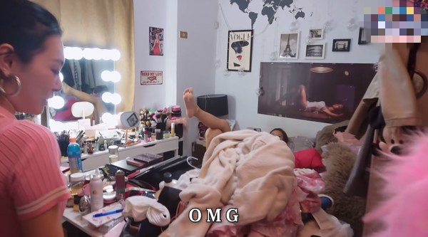 没想到,果然被王思佳猜中,当她一踏入蔷蔷房间,瞬间就被眼前景象吓傻,不仅桌上散落各式化妆品、零食,床上也堆满大量衣服,让她忍不住惊呼,"你怎么会找得到东西啦"!