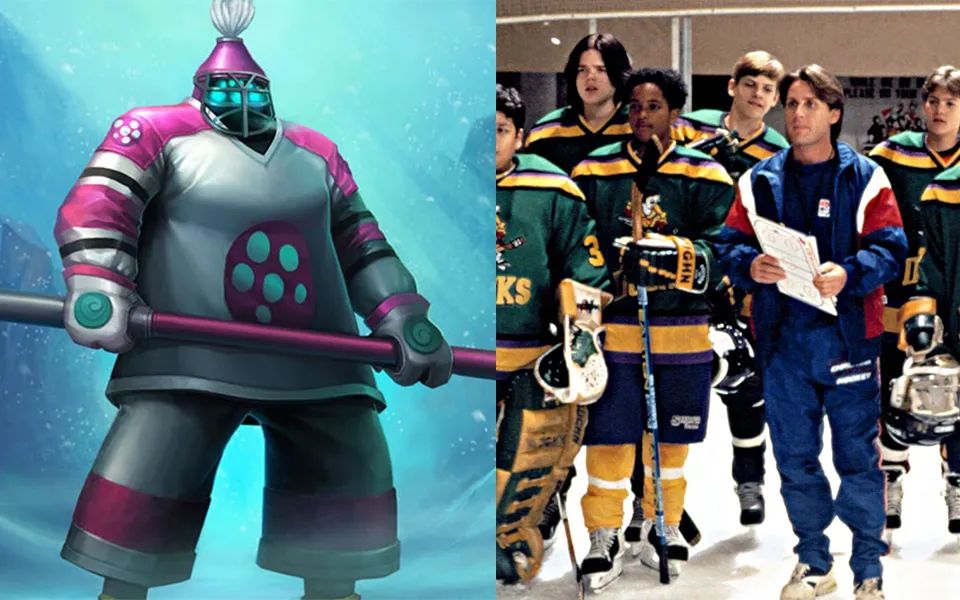 冰球队员贾克斯,这款皮肤的背景来源于喜剧电影《the mighty ducks》,中文翻译叫“野鸭变凤凰”,该电影主要讲述了心高气傲的律师戈登庞贝,为社区服务的法院判决下,被迫担任儿童冰上曲棍球队的教练的故事,而这款皮肤也对应的是冬奥会中的冰球运动。