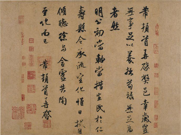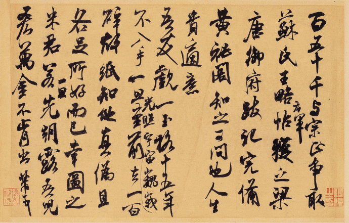 释文:百五十千与宗正争取苏氏王略 右军 帖 获之 梁唐御府跋记完备 黄秘阁知之 可问也 人生贵适意 吾友觑一玉格 十五年不入手 一旦光照宇宙 巍峨至前 去一百碎故纸 知他真伪 且各足所好而已 幸图之 米君若一旦先朝露 吾儿吝 万金不肯出 芾顿首