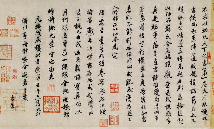 米芾精于鉴别古书画,徽宗时被召为“书画学博士”,这个职务他担任了很久。宋代宫中藏品他多得预观,“便殿赐对询移晷”,连皇上也每每不耻下问,向其请益。米芾凡遇古器物书画,即极力求取,家藏古物法书碑帖至富,是北宋首屈一指的私人收藏家。他在《画史》中沾沾自喜说:“余家最上品书画,用姓名字印、审定真迹字印、神品字印、平生真赏印、米芾秘箧印、宝晋斋印、米姓翰墨印、鉴定法书之印、米姓秘玩之印。玉印六枚:辛卯米芾、米芾之印、米芾氏印、米芾印、米芾元章印、米芾氏,以上六枚白字,有此印者皆绝品。玉印唯著于书帖,其他用米姓清玩之印者,皆次品也。无下品者。其他字印有百枚,虽参用于上品印也。自画古贤唯用玉印。”