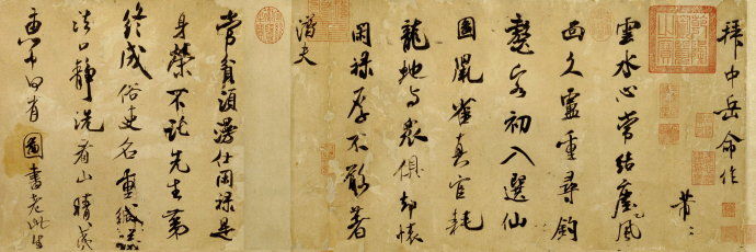 米芾对自己练字要求极高,必须“稳不俗,险不怪、老不枯,润不肥”。他写《海岱诗》,写了三四遍,只有一两个字自己还算满意,如此苦练,终于创造了“米体”书法。苏轼为之赞道:“米书超逸入神”。我曾经买过好几本米芾的字帖,也在博物馆与碑林上细细品味他的字,他现存有《方圆庵记》《苕溪诗帖》《蜀素帖》《拜中岳命诗》《多景楼诗》,皆在字里行间,显示出雄健清新、圆润遒劲的风格。在字的结构上,厚重而爽利,险绝而沉稳,通篇看来,显示了欹纵变幻而顾盼生情的艺术特点。