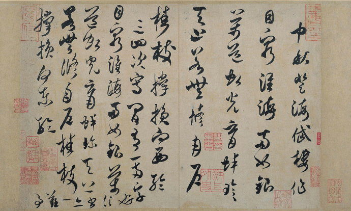 米芾平生于书法用功最深,成就最大。米芾自称自己的作品是“集古字”,对古代大师的用笔、章法及气韵都有深刻的领悟,这也在一定程度上说明了米芾学书在传统上下了很大功夫。米芾未卷入政治漩涡,生活相对安定,后当上书画博士,饱览内府藏书,熟谙千载故事,古人得失,如数家珍。他少时苦学颜、柳、欧、褚等唐楷,打下了厚实的基本功。苏轼被贬黄州时,他去拜访求教,东坡劝他学晋。元丰五年(1082)开始,米芾潜心魏晋,以晋人书风为指归,寻访了不少晋人法帖,连其书斋也取名为“宝晋斋”。今传王献之墨迹《中秋帖》,据说就是他的临本,形神精妙至极。米芾一生转益多师,在晚年所书《自叙》中也这样说道:“余初学,先学写壁,颜七八岁也。字至大一幅,写简不成,见柳而慕其紧结,乃学柳《金刚经》。久之,知其出于欧,乃学欧。久之,如印板排算,乃慕褚而学最久,又摩段季转折肥美,八面皆全。久之,觉段全泽展《兰亭》,遂并看法帖,入晋魏平淡,弃钟方而师师宜宫,《刘宽碑》是也。篆便爱《咀楚》、《石鼓文》。又悟竹简以竹聿行漆,而鼎铭妙古老焉。”