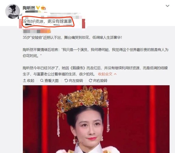 近日,安陵容的扮演者陶昕然在某平台转发某大v文章并评论称“没有好资源,更没有嫁富豪。”似乎是否认了嫁豪门的传闻,不过随后她又删除了动态,引发网友热议。