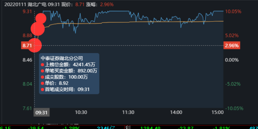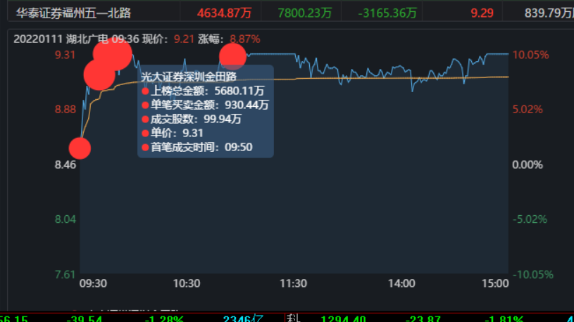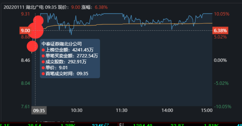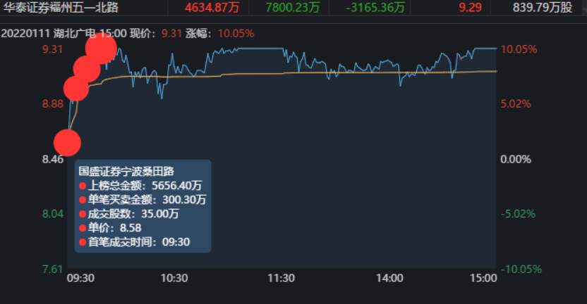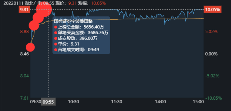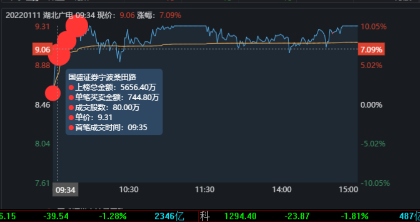 牛股湖北广电今日龙虎争夺激烈,早盘小幅高开0.12%,随后在“光大证券深圳金田路”,“国盛证券宁波桑田路”,“中泰证券湖北分公司”的合力下,9点42分封板成功,主要买盘有: