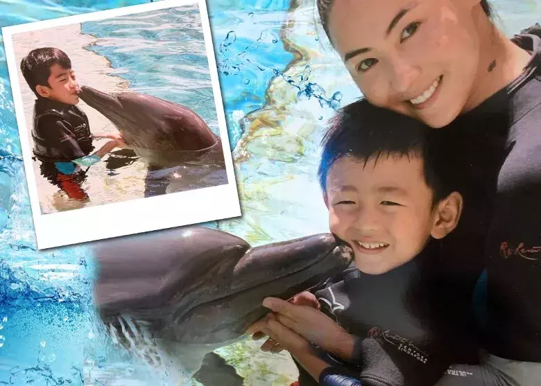 柏芝还在社交软件上发布了照片,照片清晰可见身着潜水衣的柏芝跟二儿子谢振南(quintus),在水中大手叠小手托住海豚的下巴,还小的很开心。而大儿子谢振轩(lucas)则勇敢的与海豚来了个亲密接触,她用手轻轻的托住海豚下颚,还嘟起嘴巴跟海豚亲亲,海豚亦温驯配合,画面超级有爱!