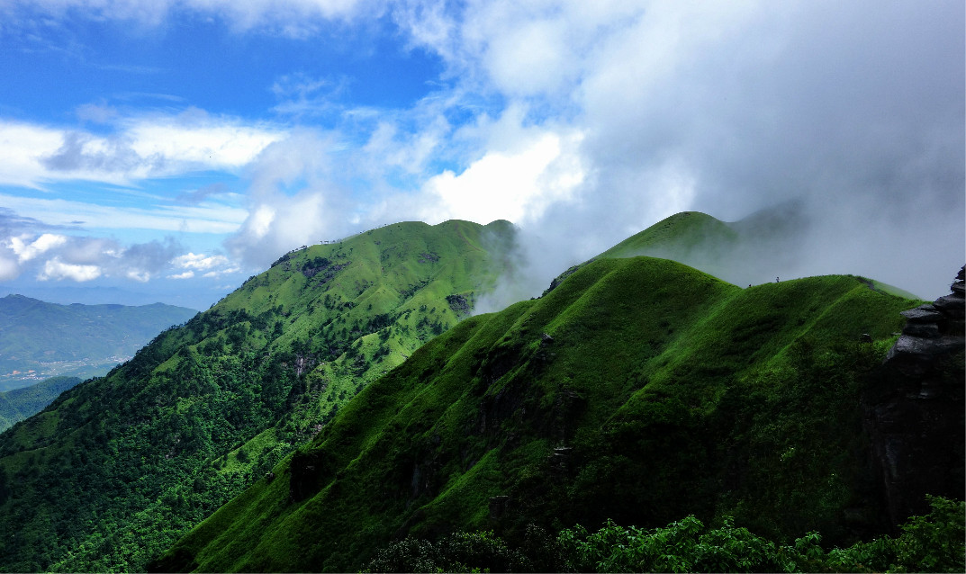 这一段路程山高谷深,群山巍峨,禾草铺翠,雾起云飞,是徒步武功山的精华路段