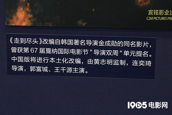 展位中贴出的海报下面写道“《走到尽头》是改编自韩国著名导演金成勋的同名影片,曾获得第67届戛纳国际电影节导演双周单元提名,中国版将进行本土汉化改编,由黄志明监制,连奕琦导演,郭富城和王千源主演”。