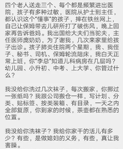 其实,从之前李国庆力挺俞敏洪歧视女性、公开支持刘强东不需要为婚外情道歉,以及他谈及夫妻创业带来的商业纠葛后,还顺带表达一句:“俞渝作为妻子,从没给我洗过袜子。”等言行来看,我都能从俞渝控诉自己在这段婚姻中付出了多少、忍耐了多少中,感受到一个女人多年来万分艰难的隐忍。