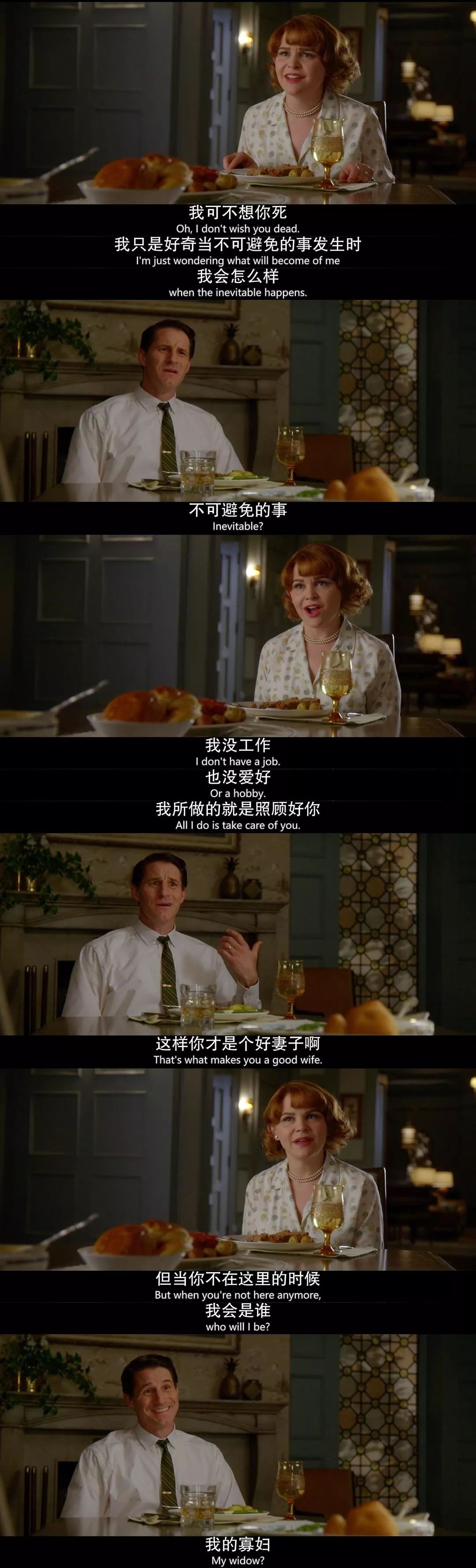 在这部剧中,女主一贝丝生活在传统的60年代,作为传统社会角色塑造出来的妻子和母亲,她将所有的幸福都寄予在虚假繁荣的婚姻关系里。