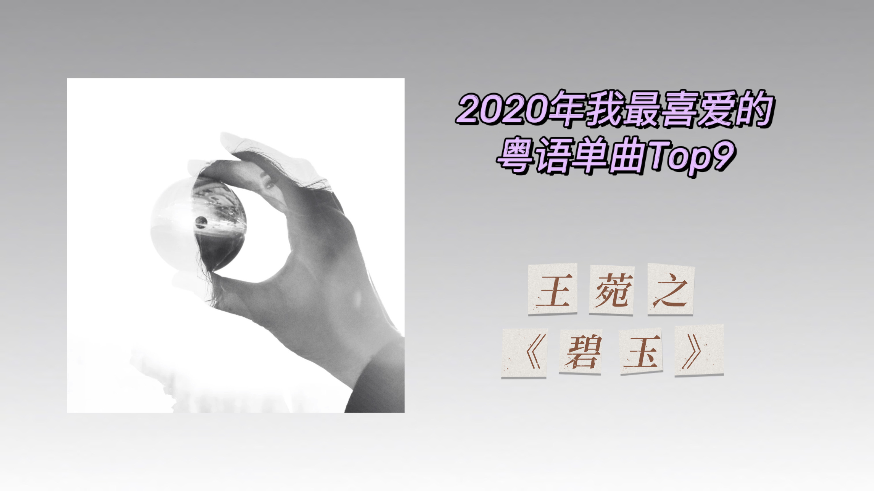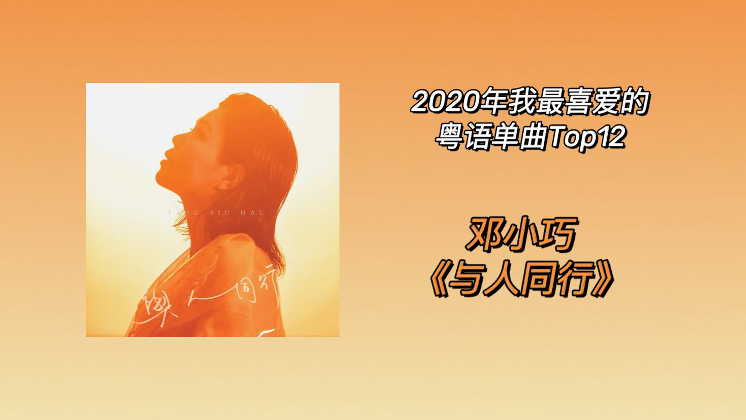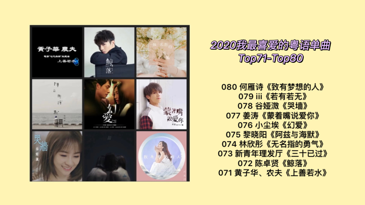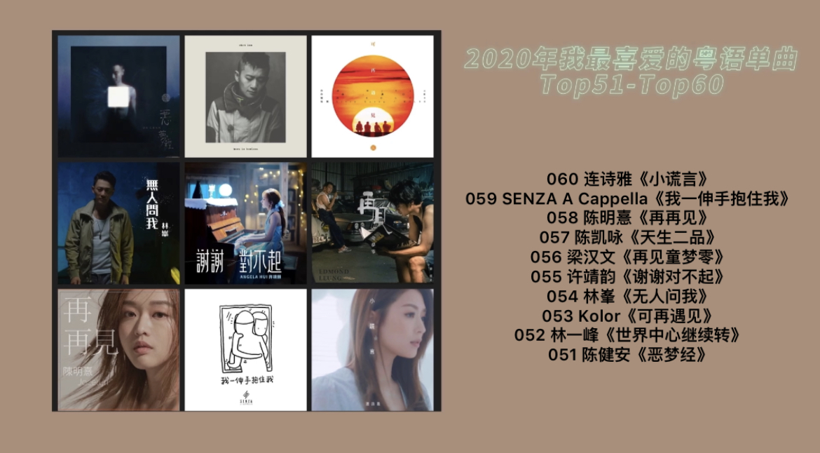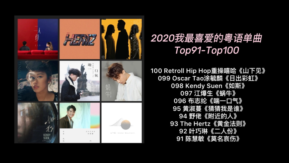 继粤语专辑的盘点之后,这次是“2020年我最喜爱的粤语单曲”年度盘点,依然是按照一个单位音乐人(个人/组合)一首歌,做今年我最喜爱的年度粤语单曲top100(另附一首至尊歌)。