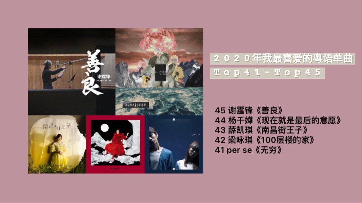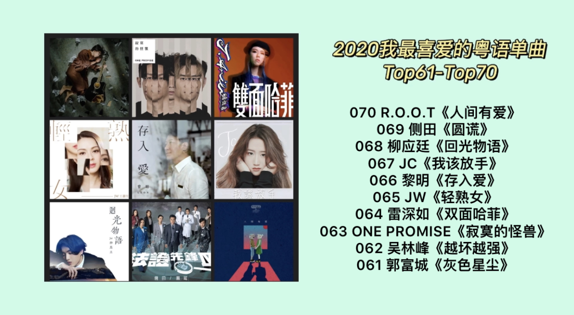 91-100的排序不乏一些选秀新人的作品,也有一些偏向于实验性和社会性的音乐呈现。可能从主流视野上看,这些歌手都不算正当红,但这些歌也是2020年推出的粤语歌里的一些品质之作。