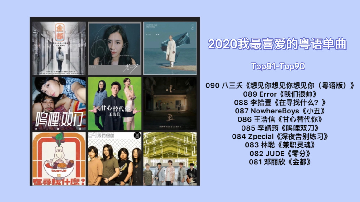相比91-100位的十首歌,这次选出的2020年我最喜爱的粤语歌第81-90位,流行度往往更胜一筹,但歌手的演唱、包括作品的创作呈现,都可以更好。对他们的既定期待值,会让我对他们接下来的作品还持续观望。