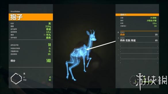射击肺部才是真正高效的猎杀方式。射击从侧面来看动物身上面积最大的重要器官就是双侧的肺部,在游戏中你用合适口径的子弹射击合适的动物的肺部,往往可以一枪结束猎物的生命,不需要费时间再去追踪。举个例子:使用.270 win子弹在双肺命中的前提下射杀一头白尾鹿,那么白尾鹿就会立刻原地死掉。但是你是用.270 win子弹在双肺命中的前提下射杀一头驼鹿(世界上已知最大的鹿),那么这头驼鹿也会死,但是往往你要跑好远。与之相似的,射击动物肝脏也会导致动物较快死亡,但是不一定能立刻死亡。如果你想用.270 win射杀一头驼鹿,那么最好的射击点是脊椎和脑部,不过射击脑部的前提是你的子弹不要被坚硬的头骨完全挡住,不然驼鹿依旧会跑很远才死掉。所以最理想的位置是脊椎,确切的说是要尽量干净利索的切断“反应神经中枢”,只有这样才能让猎物快速死亡。