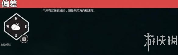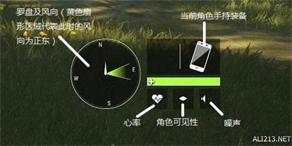 1. 罗盘及风向。指针所指的方向是玩家的面对方向。黄色扇形区域代表当时的风向,风向设定是《狩猎》这款游戏中影响猎物追踪成功率的重要设定之一。风向会携带你身上的气味,若让动物闻到则会心生警惕。风向及强度会决定气味的传播程度。若风强,气味则传播的更远,但传 播方向仅会沿着风向。瑞风弱,气味传播不会太远,但蔓延的范围较大。气味消除喷雾可暂时的掩盖气味。