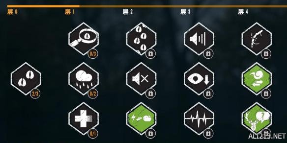 2. 追踪狩猎(技能树 stalker):难度较大的狩猎方式,首先这种狩猎方式需要猎手时刻注意自己移动产生的噪音,如果噪音太大动物们会很远听到,然后跑的离你远远的(除非有很大的风声或者雷雨声帮你做掩盖);其次这种狩猎方式需要猎手时刻注意风向,因为风会将人的气味吹出去很远的距离导致动物们警觉,所以一旦选择追踪狩猎,那么一定要让自己时刻处于下风位(使用气味掩盖喷剂也是可行的方式);最后这种狩猎方式需要玩家懂得查看动物留下的一切痕迹(足迹、粪便等),懂得分辨痕迹都是如何产生的,假设不能很好的分辨足迹的产生原因,那么你将会被那些痕迹搞得晕头转向。追踪狩猎中还需要玩家时刻聆听周围的动静,利用动物发出的各种声音来判断周围情况(这些声音包括叫声和脚步声等),帮助自己更好的找到猎物。