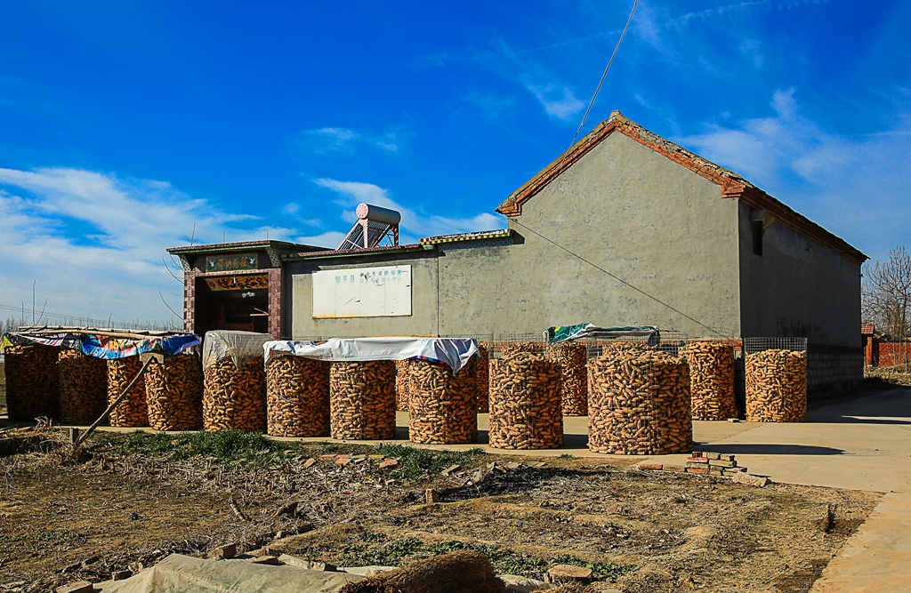 秋天收获的玉米还在晒着没有脱粒,几十年的生产习惯还在延续。那时人们为了赶秋种麦,把棒子掰来家里,有的上屋顶,有的挂树上,还有的如这样扎网存着,待冬天有时间了再脱粒粜出去。现在,基本上是现收现卖,自己储存的已经很少了。